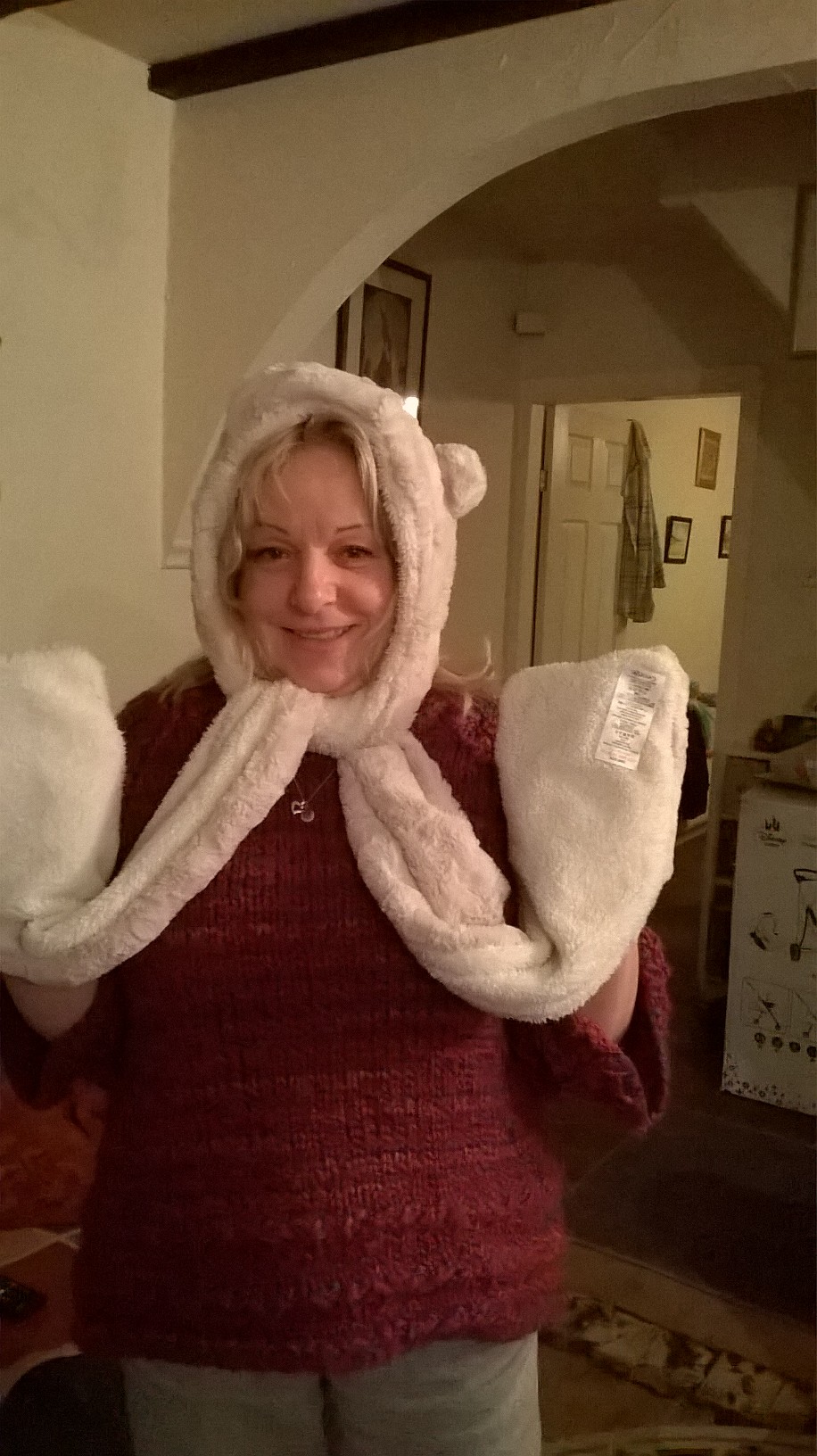 Nice to know that he was bothered though, and as I walked home, grinning to myself, I put it down to my new head gear. Our Son’s girlfriend and her little girl came down to see us over Christmas, and she had a hat affair, with ears, and a scarf attached and a place to keep your hands. I said,