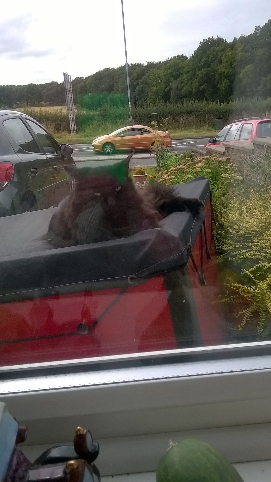 These two brothers live next door; they use our son’s trailer as a handy resting place in the afternoons. The black canvas gets warm and they have a good vantage point as well. The black one looks in to keep an eye on what you’re up to. The other one loves to roll over for a cuddle.